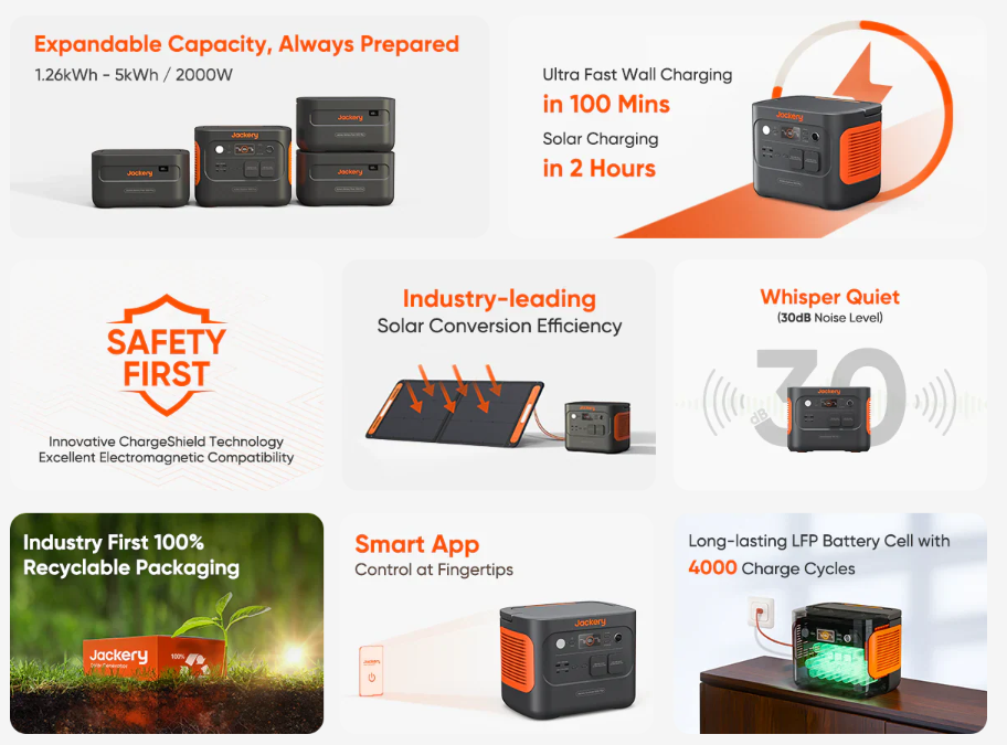 A Jackery Explorer 1000 Plus é uma estação de energia portátil de gama alta com grande capacidade e múltiplas opções de entrada/saída, concebida para fornecer energia fiável em campismo, emergências, trabalhos off-grid e aplicações profissionais. Combina bateria de alta densidade, potência elétrica robusta e carregamento rápido com compatibilidade solar.