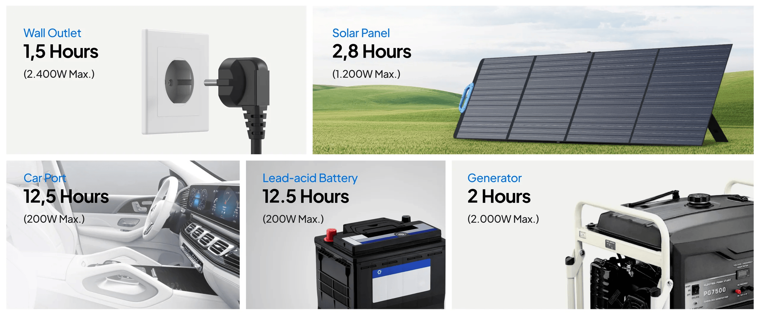 - Solar: até 1.200W (12V–145V, 15A) – tempo de recarga ≈ 2,5